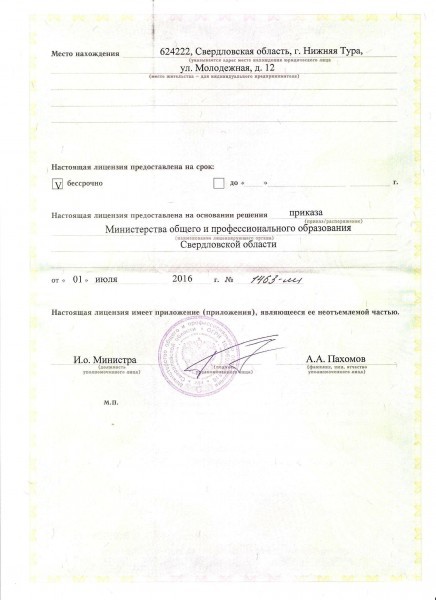 • Места осуществления образовательной деятельности по дополнительным профессиональным программам: 624222, Свердловская область, г. Нижняя Тура, ул. Молодежная, д. 12